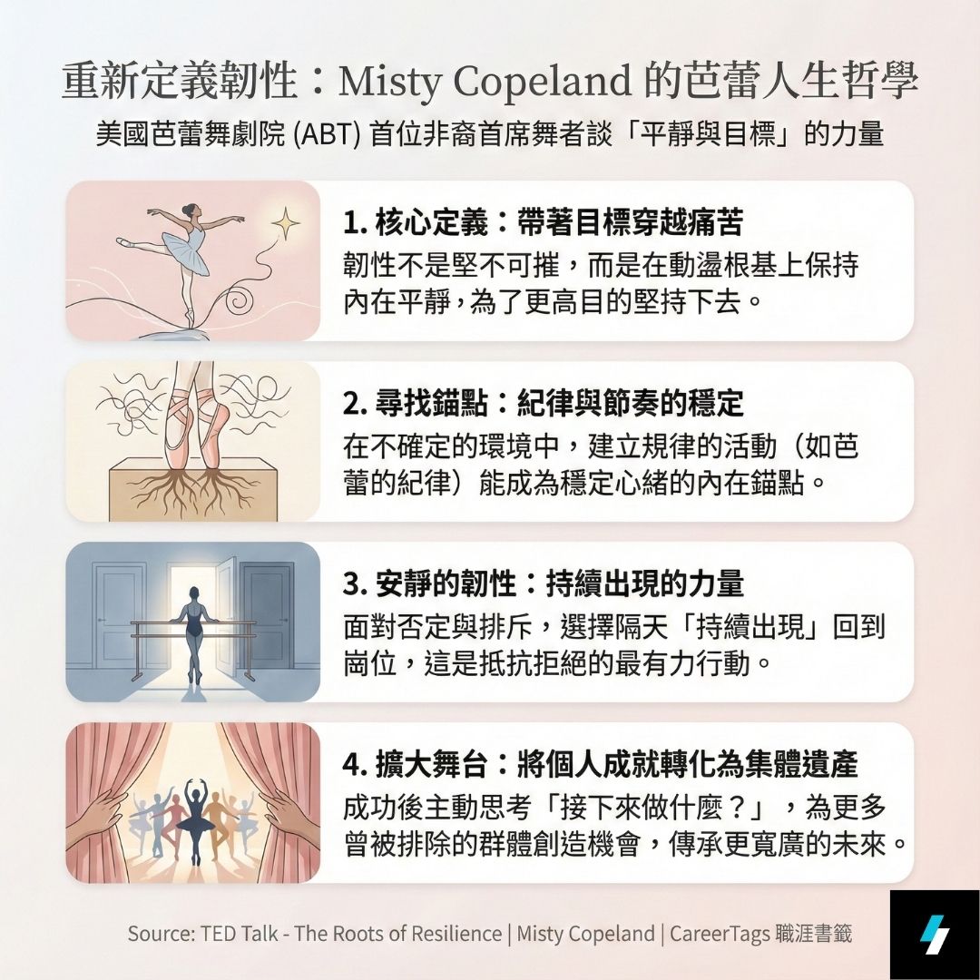 這段演講由美國芭蕾舞劇院(ABT)首位非裔首席舞蹈家米絲蒂·科普蘭(Misty Copeland)分享,其核心在於重新定義「韌性」(Resilience),並強調穩定、目的與持續出現(Showing Up)的重要性。科普蘭的人生從童年的不確定性、家庭的顛沛流離開始,正是芭蕾舞帶來的紀律、節奏與穩定感,成為她內心力量的根源,讓她能夠將痛苦轉化為藝術。